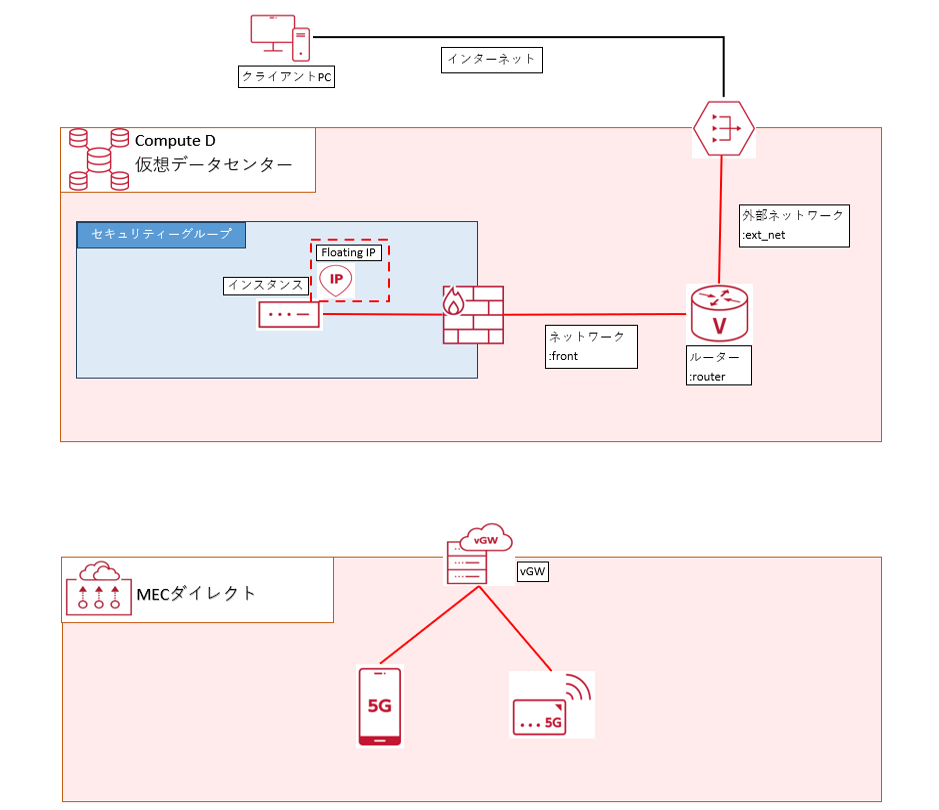 概要 本項では、下図の赤破線枠箇所のインスタンス作成を行います。 作業内容 作成したインスタンスにFloating IPを設定します。 詳細については以下をご参照ください。 Floating IPのインスタンスへの割り当て