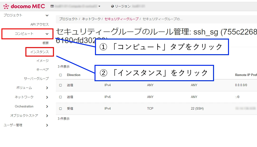 - 管理画面左側の「コンピュート」タブから「インスタンス」をクリックします。