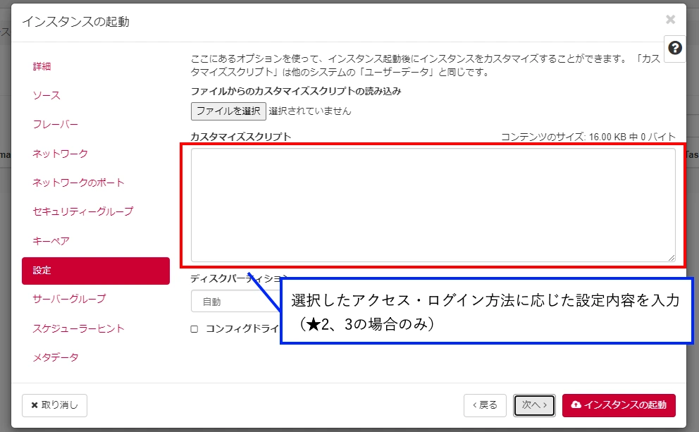 - 認証方法の選択にて選んだ方法に応じて、「カスタマイズスクリプト」が★2または★3である場合は本項の設定を行い、★1の場合は行いません。 本設定を行うことで、任意に設定したユーザー名とパスワードを用いてインスタンスにログインすることができます。