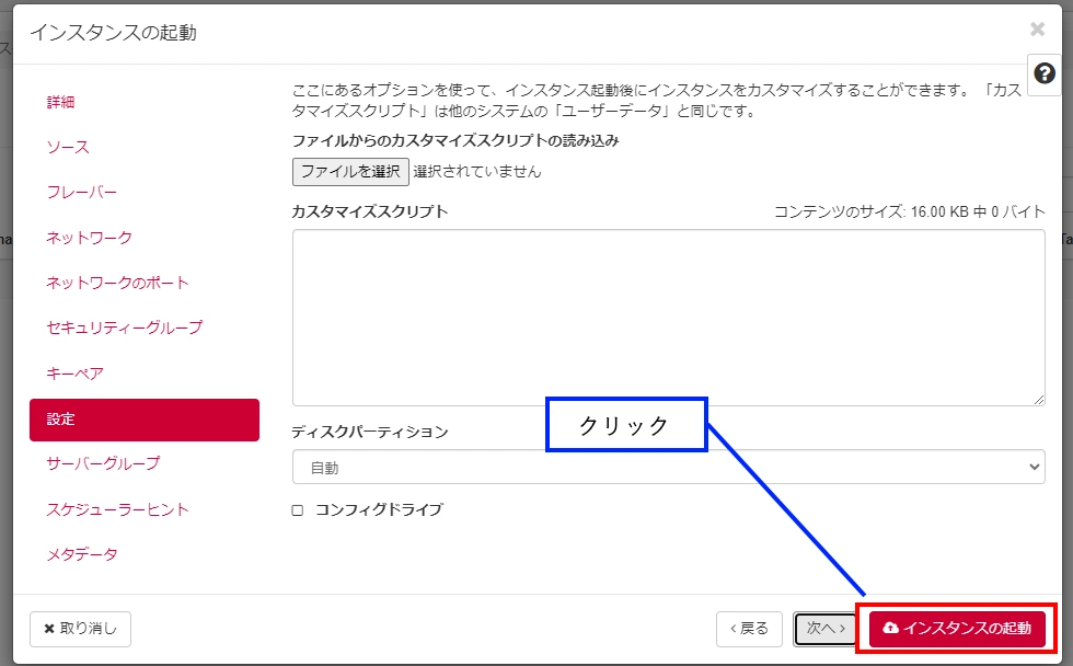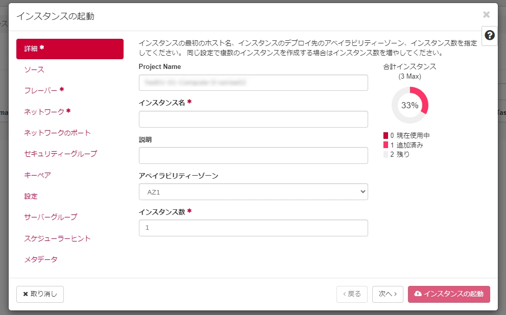 ※「設定」タブ、「サーバグループ」タブ、「スケジューラーヒント」タブはインスタンス起動後には設定できません。これらを設定する場合は、これらの設定後に「インスタンスの起動」をクリックして下さい。