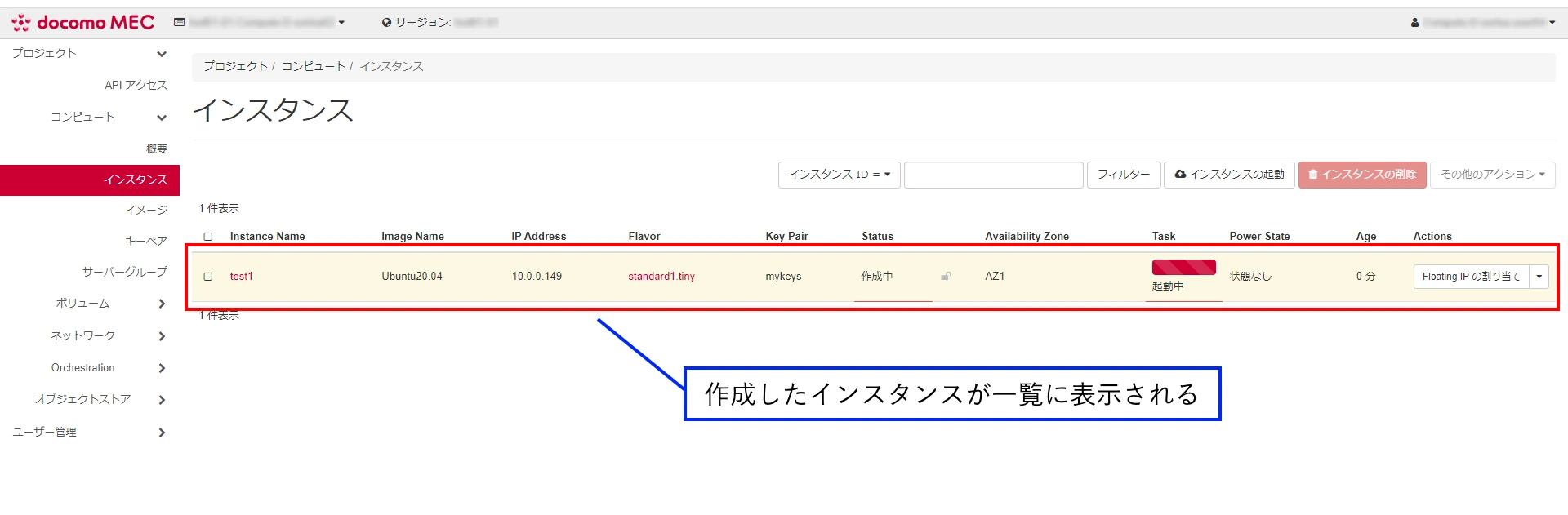 作成したインスタンスの表示を確認したら、Floating IPの割り当て等を行い、 インスタンス起動後の操作