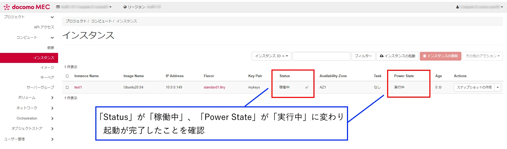 - 作成したインスタンスの「Status」が「稼働中」、「Power State」が「実行中」に変わり、正常に起動が完了したことを確認します。