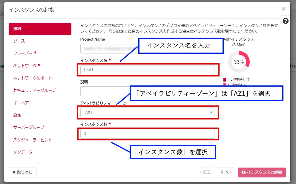 準備したネットワーク等を使用して、インスタンスを作成・起動します。 インスタンスの作成・起動