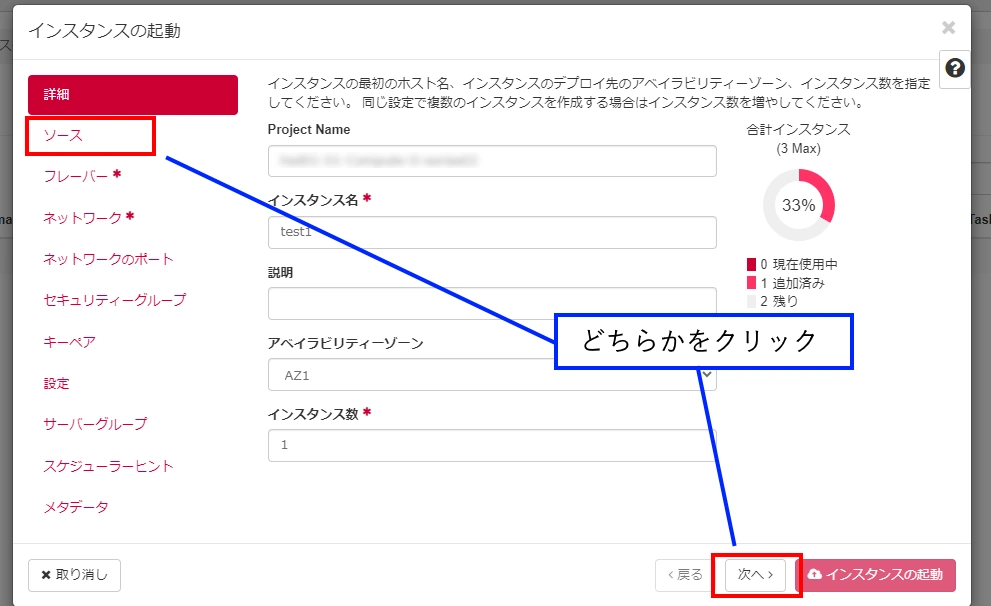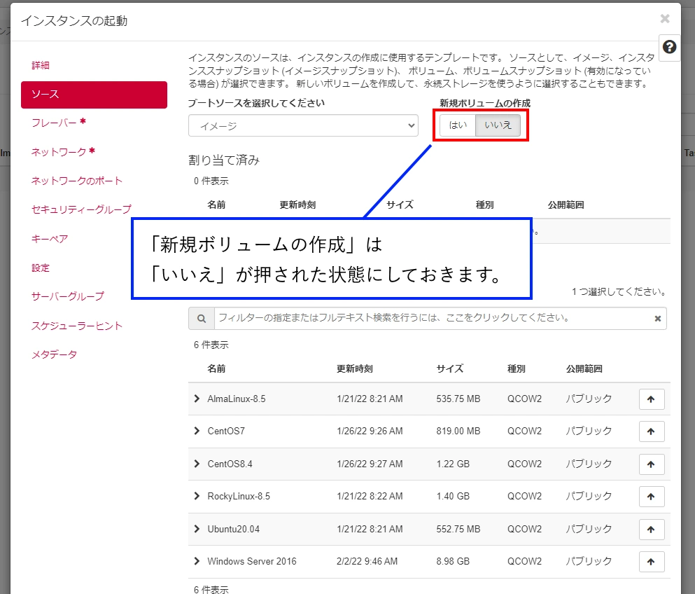 「ソース」タブでインスタンスに割り当てるOSを設定します。 「ソース」タブ