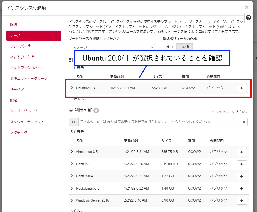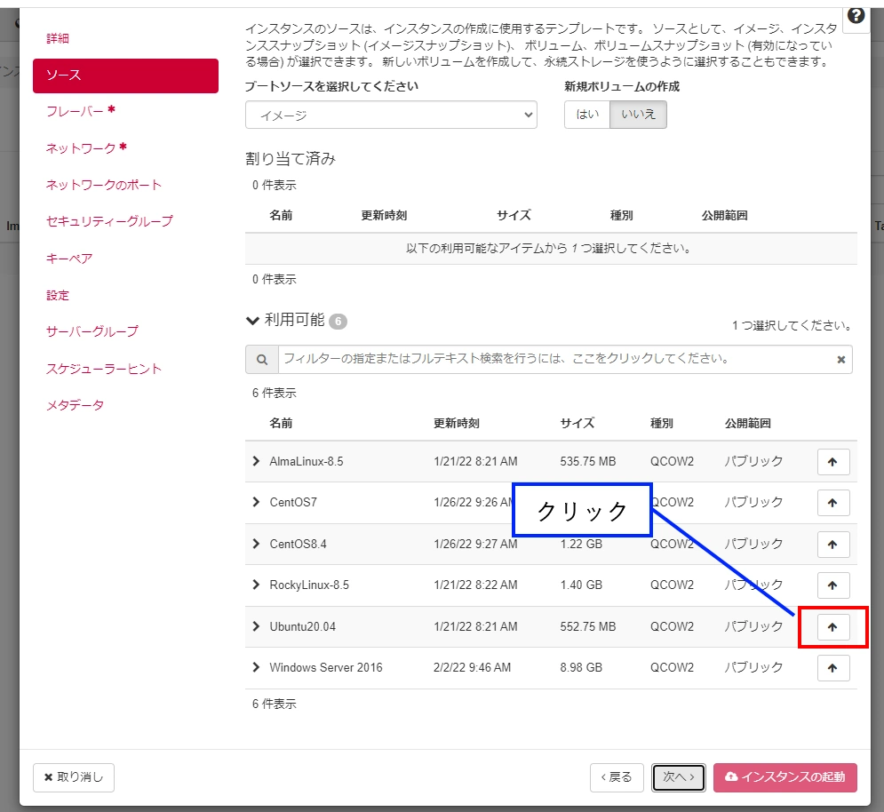 ※ リモートストレージの利用有無によらず、必ず「新規ボリュームの作成」は「いいえ」を選択してください。 リモートストレージを利用する場合は、インスタンスの起動後に、クイックスタートガイド「③リモートストレージサービスの利用」を参照して、リモートストレージの作成とインスタンスへの接続を行って下さい。 - 「利用可能」の一覧で、割り当てたいリソースの右の「↑」をクリックします。ここでは「Ubuntu20.04」を割り当てます。