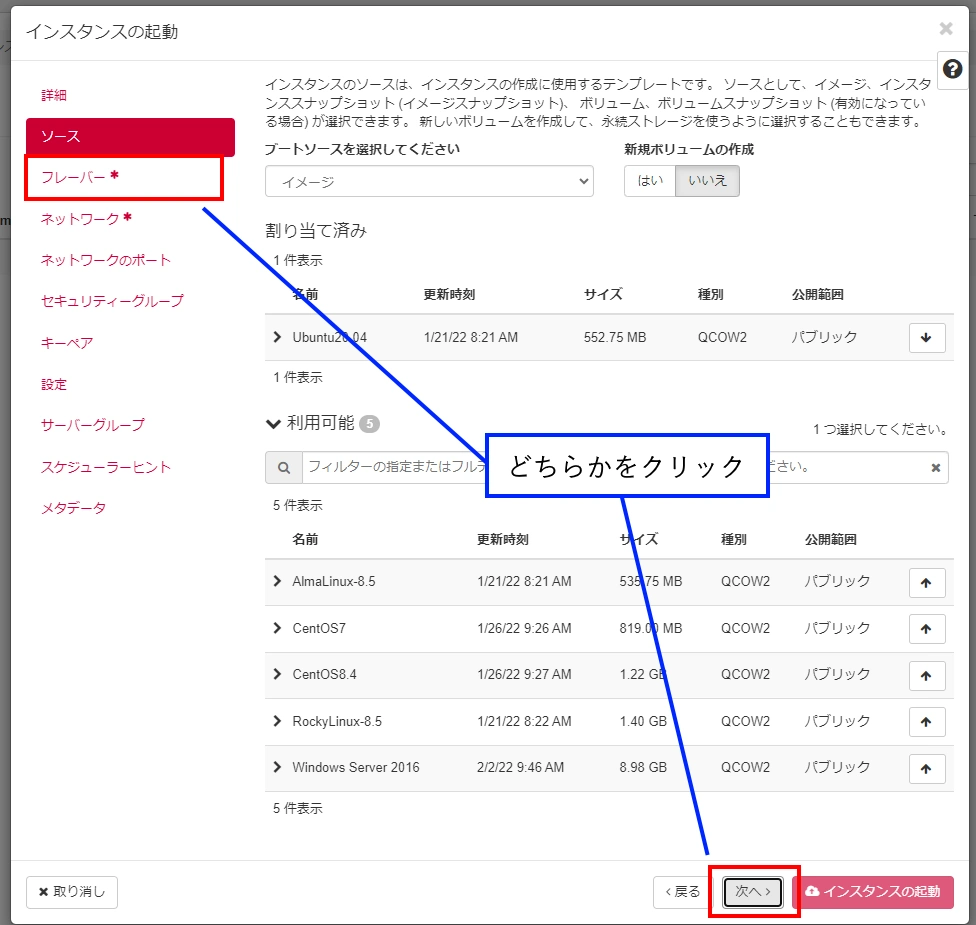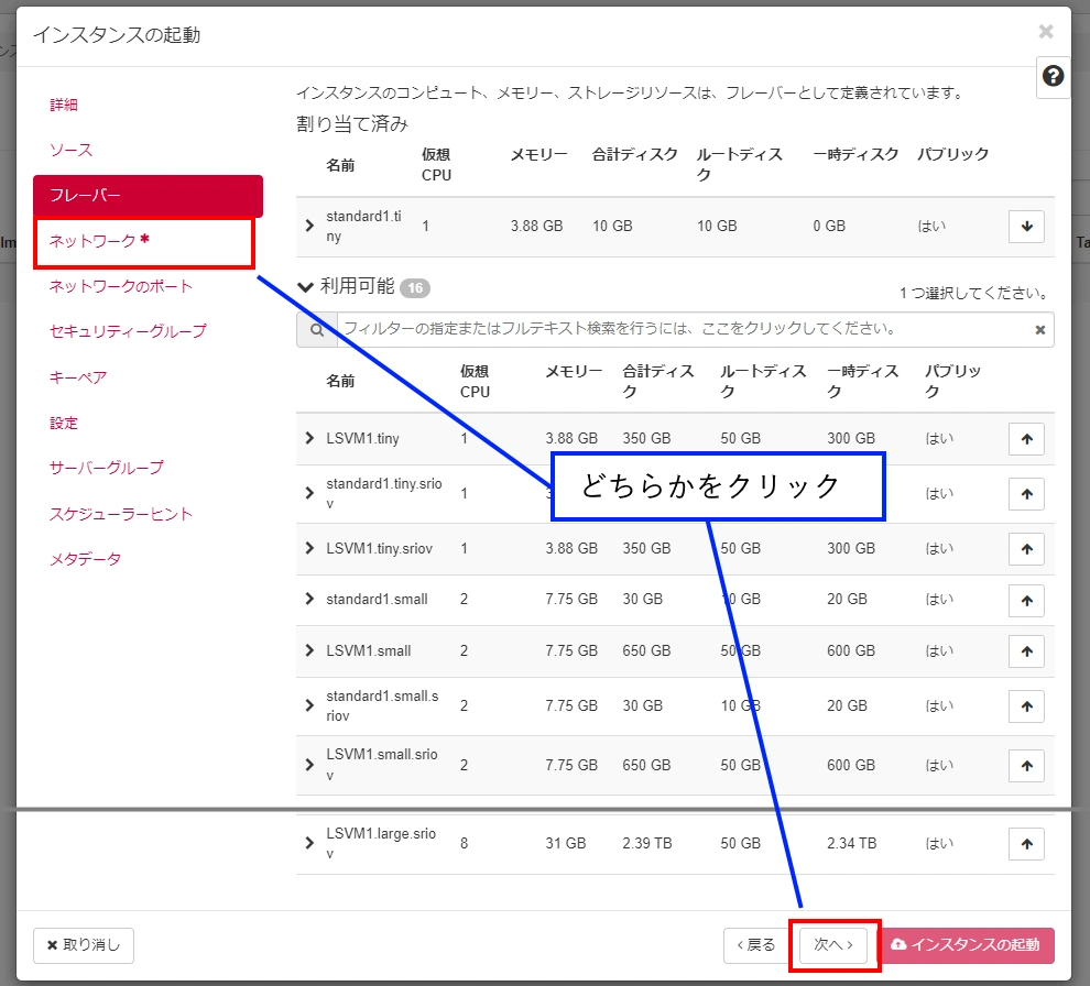 「フレーバー」タブでインスタンスに割り当てるリソース量を設定します。 「フレーバー」タブ