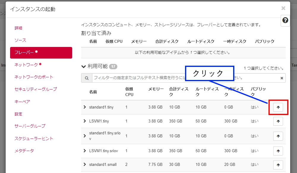 - 「利用可能」の一覧で、割り当てたいフレーバ—の右の「↑」をクリックします。ここでは「standard1.tiny」を割り当てます。