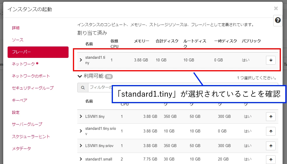 - 「割り当て済み」のフレーバーとして「standard1.tiny」が表示されていることを確認します。