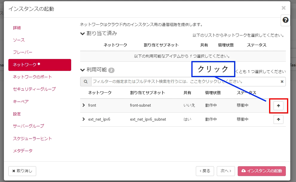 - 「利用可能」の一覧で、接続したいネットワークの右の「↑」をクリックします。ここでは作成したネットワーク「front」を接続します。