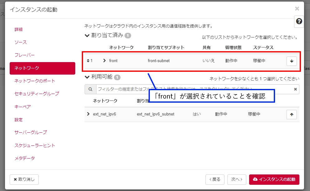 - 「割り当て済み」のネットワークとして「front」が表示されていることを確認します。