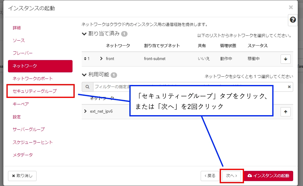- 「セキュリティーグループ」タブをクリック、または「次へ」を2回クリックします。