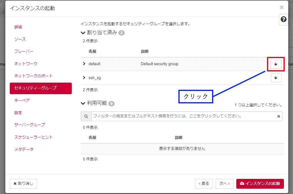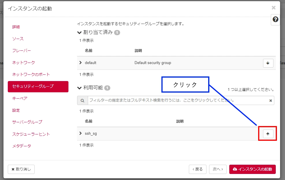 - 「利用可能」の一覧で、適用したいセキュリティグループの右の「↑」をクリックします。ここでは「ssh_sg」を適用します。