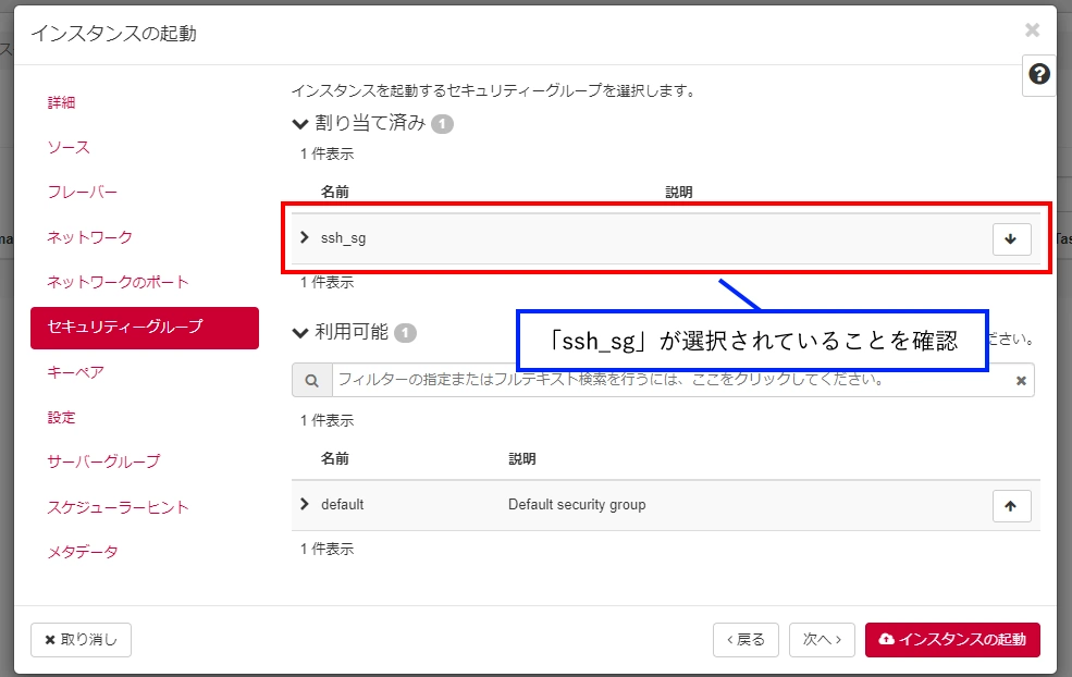 - 「割り当て済み」のセキュリティーグループとして「ssh_sg」が表示されていることを確認します。