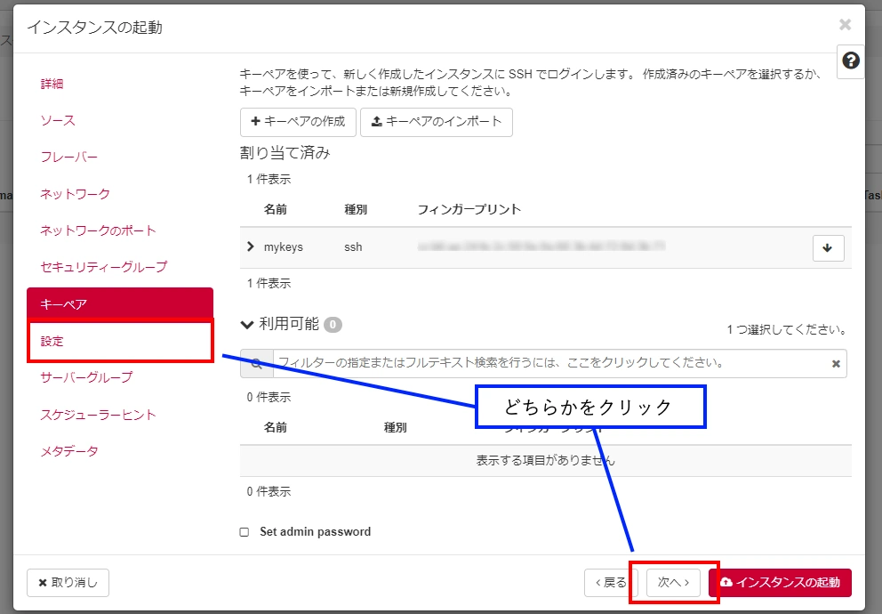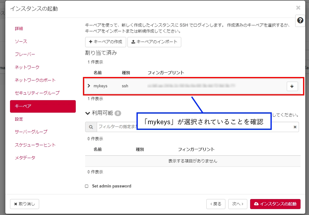 - 「利用可能」の一覧で、作成したキーペアが選択されていることを確認します(★1、★3のSSH接続の場合のみ)。ここでは「mykeys」が選択されています。