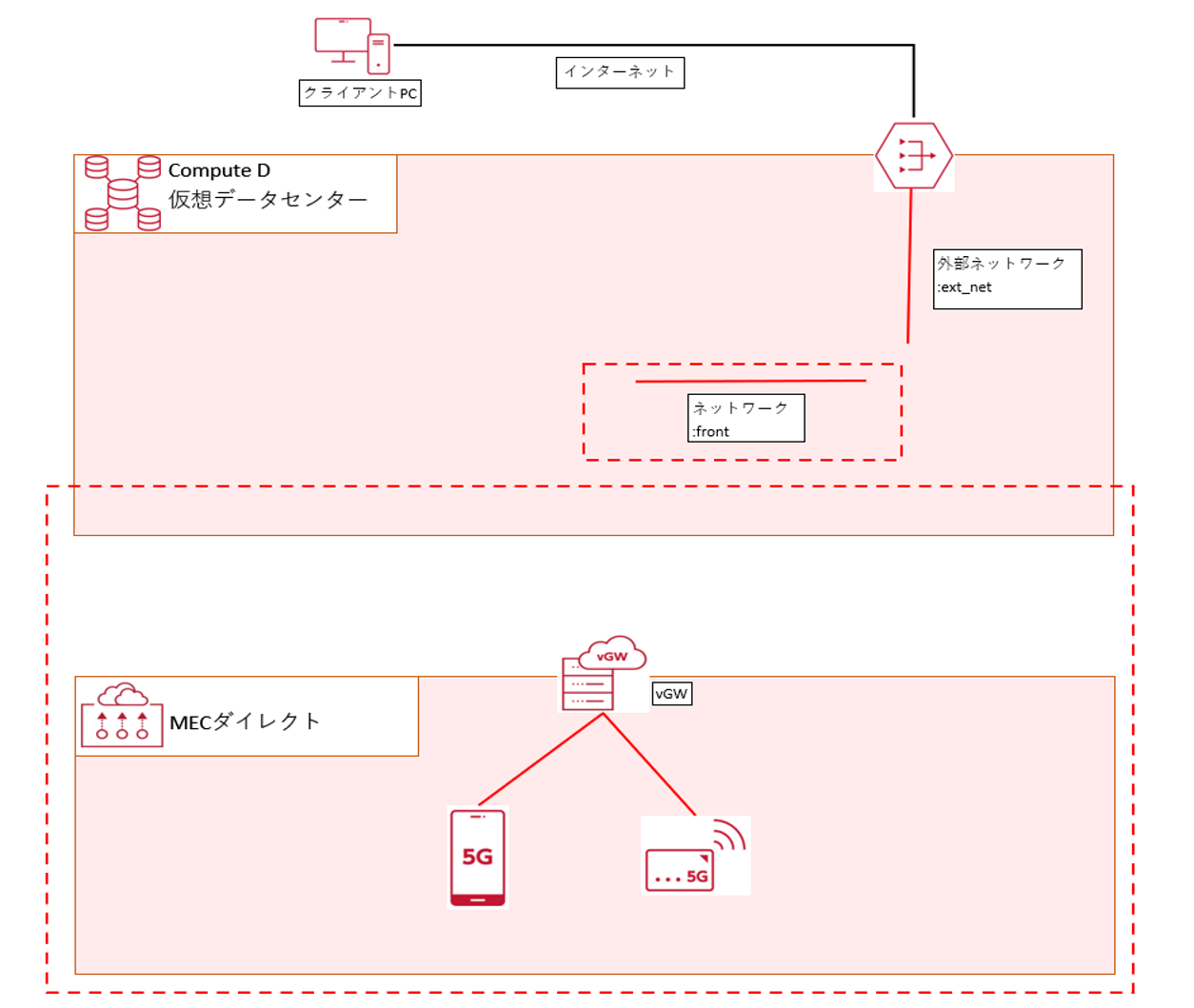 概要 本項では、下図の赤破線枠箇所のネットワーク構築を行います。 作業内容 インスタンスを接続するネットワークを作成します。 詳細については以下をご参照ください。 ネットワークの作成 ※MECダイレクトをご利用するお客様は以下も併せて実施してください。 SIMの設定をします。 詳細については以下をご参照ください。 SIM名変更 5G移動機端末の設定をします。 設定についてはお客様要件に従って実施してください。