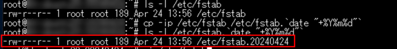 # ls -l /etc/fstab.`date “+%Y%m%d”`以下のようにバックアップが作成できていることを確認します。
