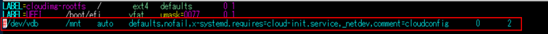 # vi /etc/fstab以下のように「/dev/vdb /mnt~」と記載されている個所のコメントアウトを外します。