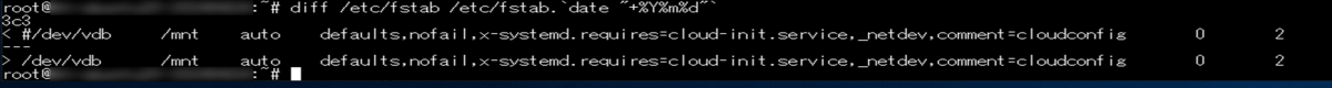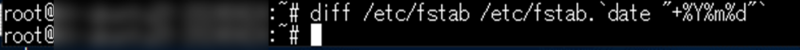 編集差分を確認します。# diff /etc/fstab /etc/fstab.`date “+%Y%m%d”`以下のように何も表示されないことを確認します。