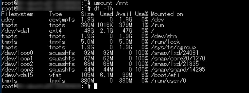 ext4で再マウントします。# df -Th以下のように「/dev/vdb」がマウントされていないことを確認します。