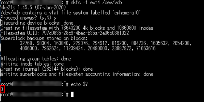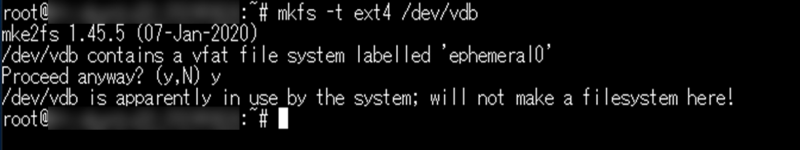 ファイルシステムを再フォーマットします。# mkfs -t ext4 /dev/vdb