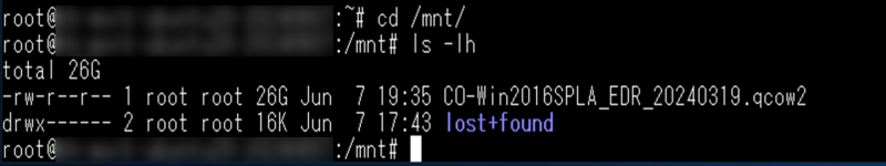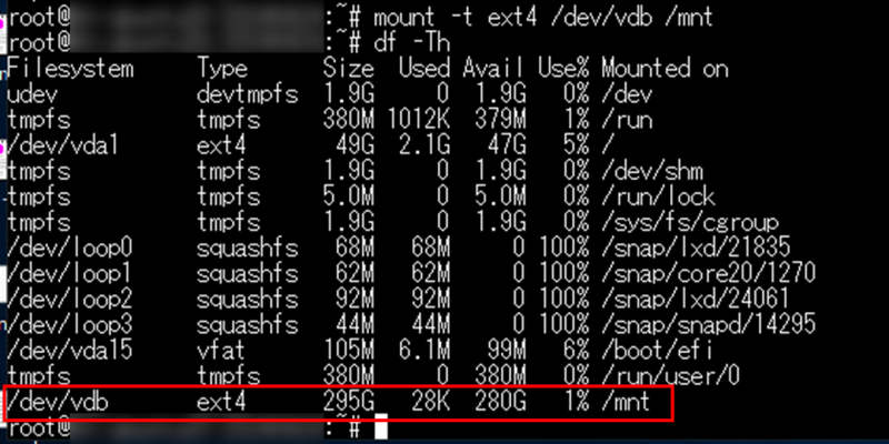 ext4で再マウントします。# mount -t ext4 /dev/vdb /mnt
