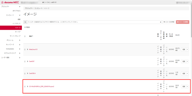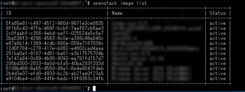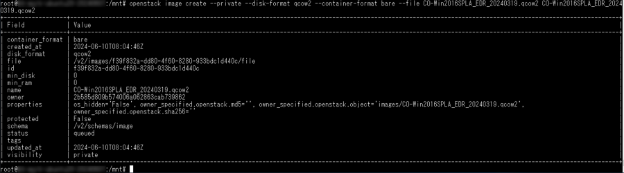 (保存しているイメージ名) (アップロードした際のイメージ名)コマンド例# openstack image create --private --disk-format qcow2 --container-format bare --file CO-Windows2016.qcow2 CO-Windows2016.qcow2
