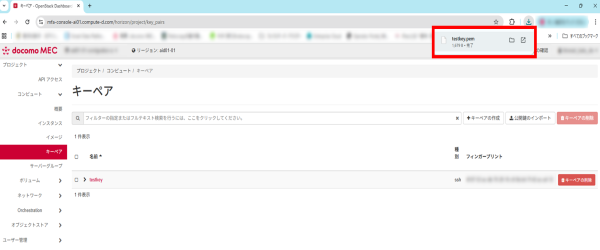 キーペアの作成が完了し、自動的に秘密鍵のダウンロードが行われます。※秘密鍵は後で再ダウンロードできません。紛失にご注意ください。