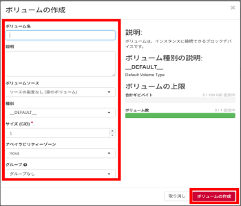 - 必要事項を入力し、「ボリュームの作成」をクリックします。