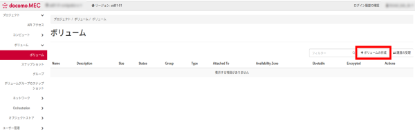 「ボリューム」タブから「ボリューム」を選択し、「ボリュームの作成」をクリックします。