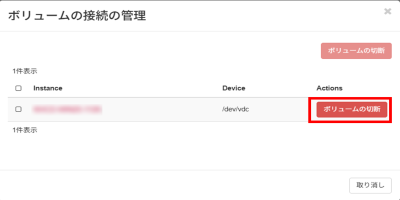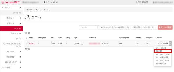 「ボリューム」タブから「ボリューム」を選択し、切断したいボリュームの「Actions」から「▼」をクリックし、「接続の管理」をクリックします。