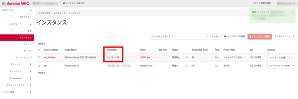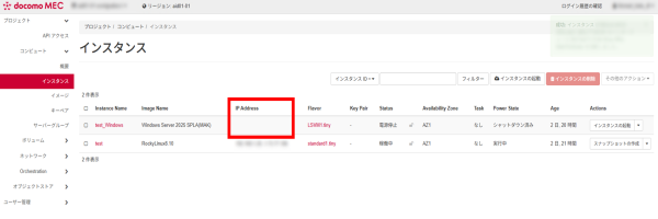 「IP Address」に指定したFloating IPが追加されていることを確認します。