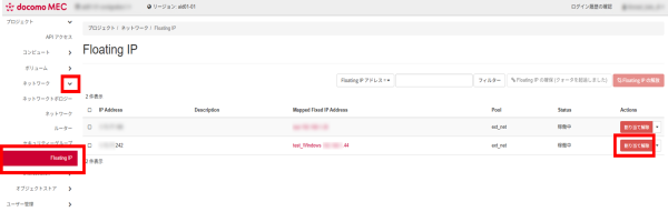 - 左側のメニューから「ネットワーク」→「Floating IP」を選択し、該当のFloating IPの「割り当て解除」をクリックします。