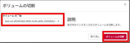 - 「ボリュームID」から切断を行いたいボリュームを選択し、「ボリュームの切断」をクリックします。