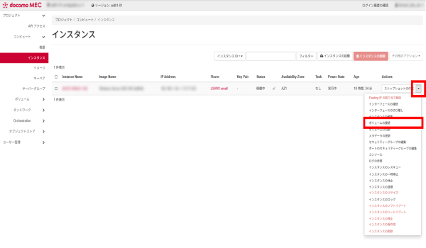 ボリュームを接続したいインスタンスの「Actions」から「▼」をクリックし、「ボリュームの接続」をクリックします。