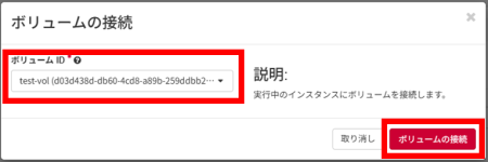 「ボリュームID」から接続を行いたいボリュームを選択し、「ボリュームの接続」をクリックします。