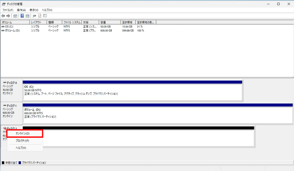 ディスク2部分を右クリックし、「オンライン」をクリックします。