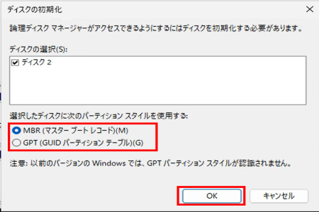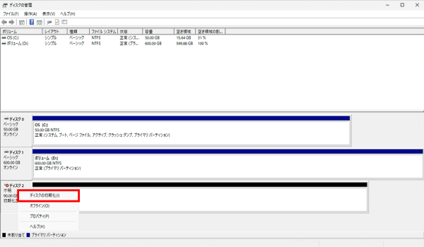 ディスク2部分を右クリックし、「ディスクの初期化」をクリックします。