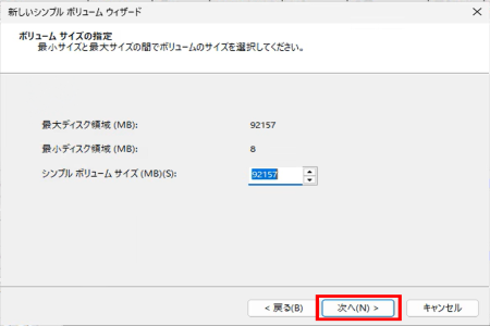 ボリュームサイズを指定し、「次へ」をクリックします。