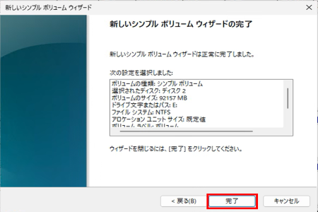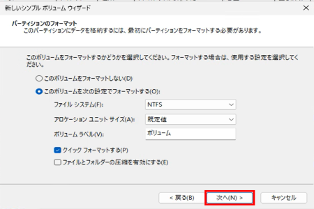 ファイルシステム、ボリュームラベルなどを指定し、「次へ」をクリックします。