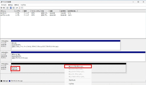 ディスク2の未割り当て領域部を右クリックし、「新しいシンプルボリューム」をクリックします。