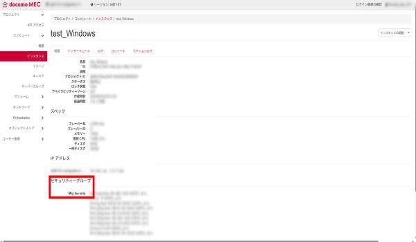 インスタンスの概要画面から、「セキュリティーグループ」に、追加したグループが追加されていることを確認します。