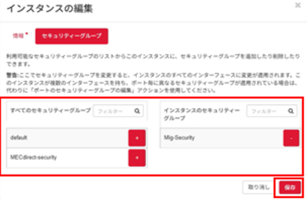 事前に設定したセキュリティーグループを「インスタンスのセキュリティーグループ」に追加し、「保存」をクリックします。