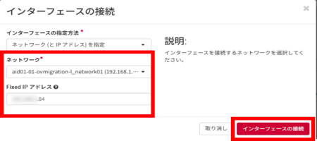 ※指定がない場合は、自動割り当てされます。「インターフェースの接続」をクリックします。
