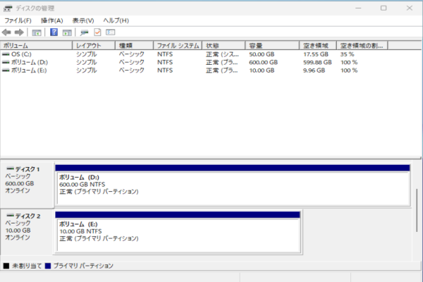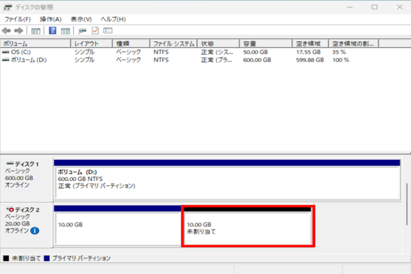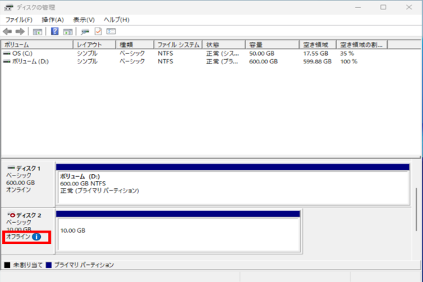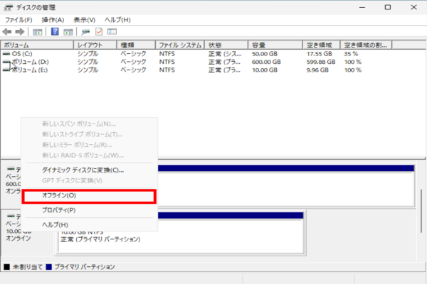 該当のディスクを右クリックし、「オフライン」をクリックします。