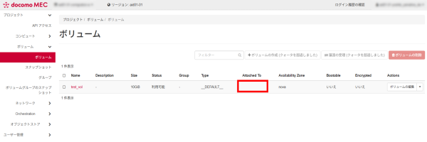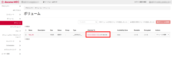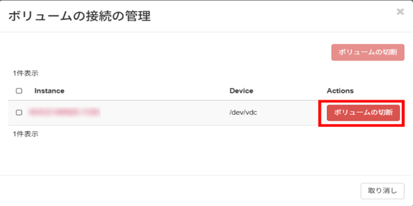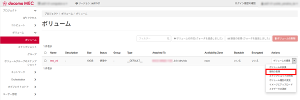 該当のボリュームの「Actions」から「▼」をクリックし、「接続の管理」をクリックします。