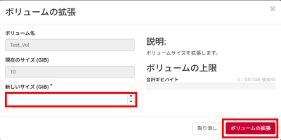 「新しいサイズ(GiB)」からボリュームのサイズを指定し、「ボリュームの拡張」をクリックします。
