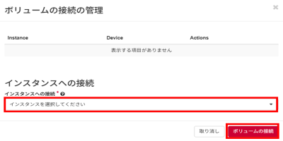 「インスタンスへの接続」から接続していたインスタンスを選択し、「ボリュームの接続」をクリックします。
