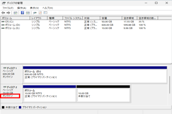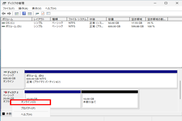 該当のディスクを右クリックし、「オンライン」をクリックします。
