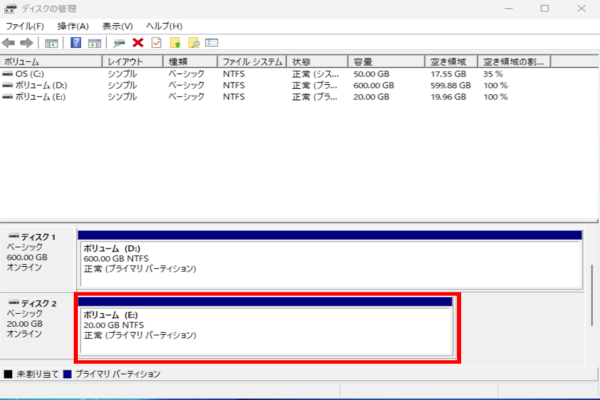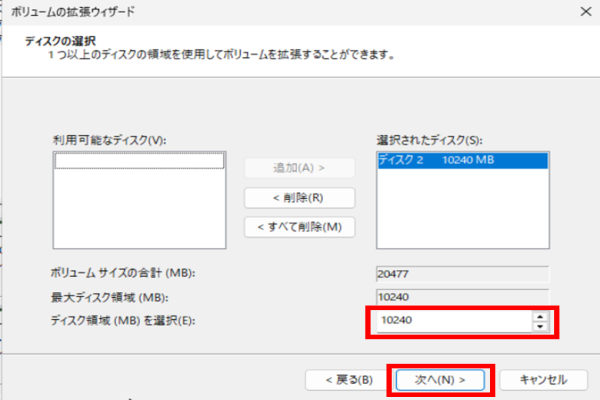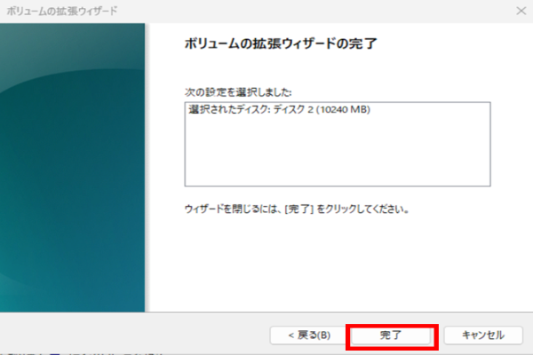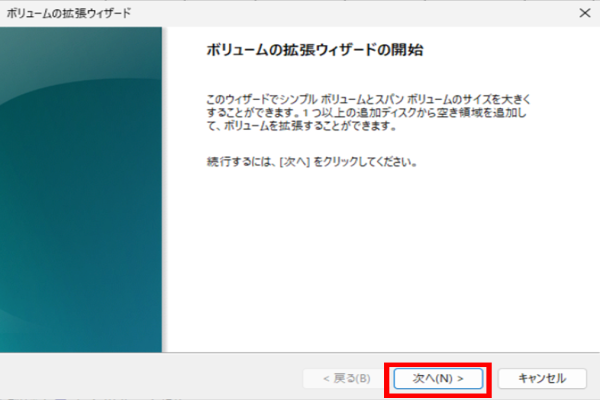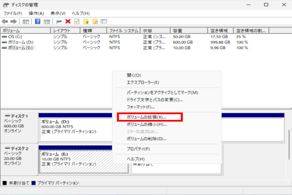 該当のディスクの既存領域を右クリックし、「ボリュームの拡張」をクリックします。