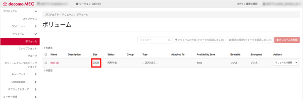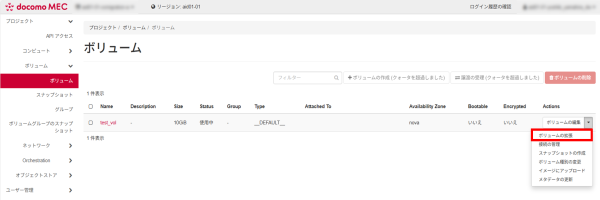 拡張したいボリュームの「Actions」から「▼」をクリックし、「ボリュームの拡張」をクリックします。
